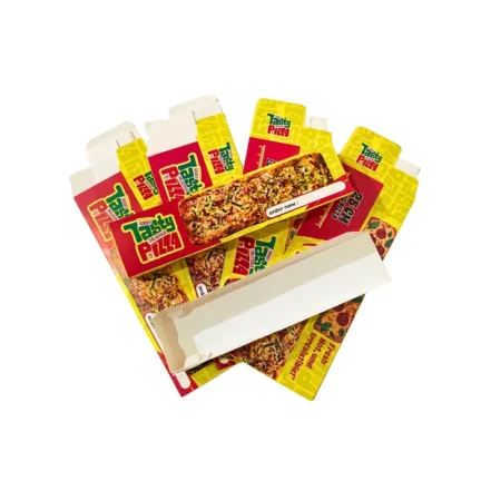 Dus pizza tarik dengan desain bergambar dominan warna kuning yang menarik dan eye-catching, cocok untuk meningkatkan tampilan produk saat disajikan ke pelanggan. Dibuat dari kertas ivory putih bersih, dus tampil rapi, higienis, dan profesional untuk kebutuhan usaha kuliner.